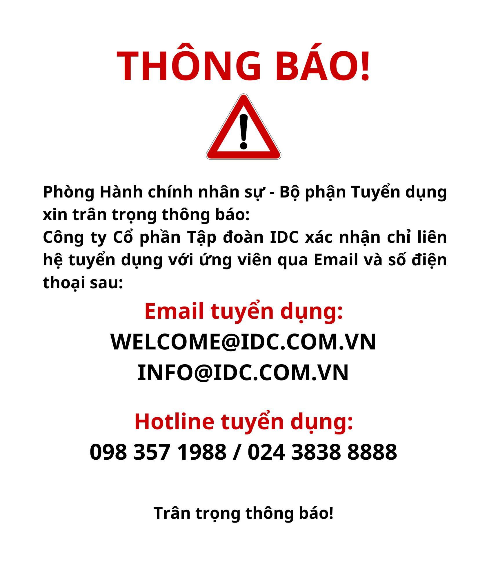 Vì vậy, bằng thông báo này, chúng tôi rất mong ứng viên lưu ý: Chúng tôi xác nhận chỉ tuyển dụng qua: Email: welcome@idc.com.vn / info@idc.com.vn hoặc