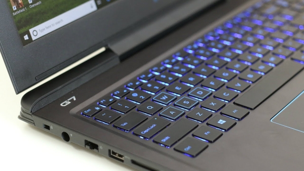 Tương tự các laptop gaming trong dòng Inspiron, Dell G7 (Inspiron 7588) có vỏ vân nhám, cứng cáp từ hợp kim magie. Tuy nhiên, thiết kế lần này khác biệt hơn ở bộ đèn led và logo Dell màu xanh bắt kịp xu hướng laptop gaming tối giản – không quá cầu kỳ nhưng vẫn “cool” đúng chất game. Dell G7 sở hữu bàn phím có độ nảy tốt, không bị hiện tượng “dính” phím khi gõ. Bàn phím này được thiết kế theo tiêu chuẩn chống nước mới, hoàn toàn tách biệt với phần cứng bên dưới.