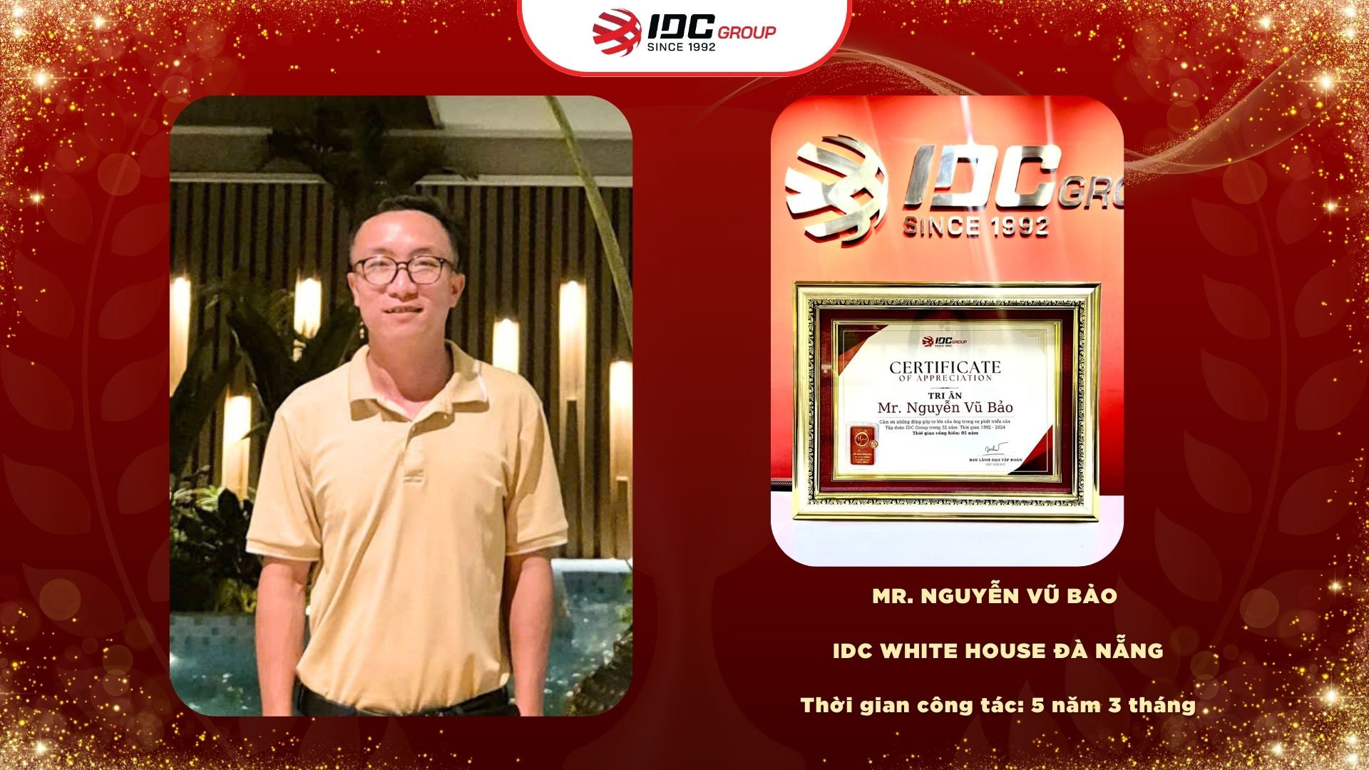 IDC GROUP xin dành những lời tri ân và món quà đặc biệt đến các cá nhân đã đạt các mốc gắn bó 5 năm và 10 năm với Công ty. Sự cống hiến của các Anh/Chị chính là nền tảng cho sự phát triển bền vững của IDC. Chúng tôi vô cùng biết ơn và tự hào vì có các Anh/Chị đồng hành trên hành trình này.