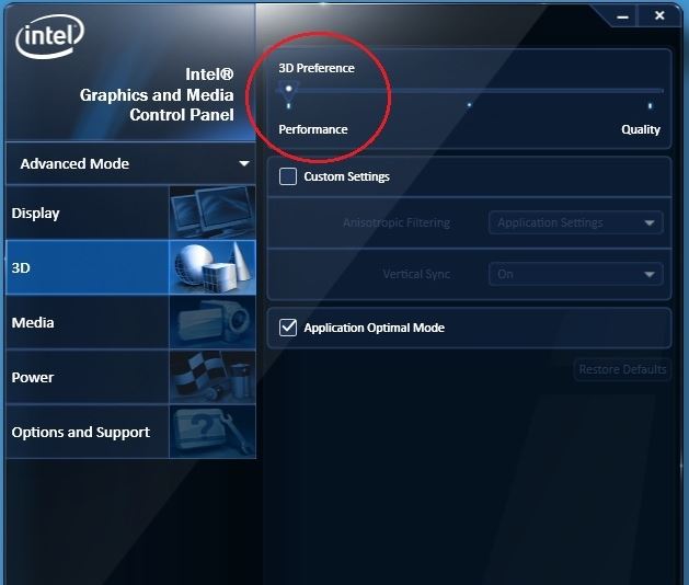 1. Chất lượng (Quality) hình ảnh: Tinh chỉnh tùy chọn này sẽ làm sắc nét các điểm ảnh trong một vật thể nhưng sẽ làm chậm hiệu năng vì hình ảnh phải có thời gian phân giải. Còn như hình ảnh trên, bảng điều khiển đồ họa Intel HD, bạn có thể lựa chọn tăng hiệu suất và giảm chất lượng vật thể. Điều này cải thiện đáng kể hiệu năng đồ họa, mặc dù có kết quả hình ảnh sẽ bị mờ. Bạn có thể giữ nó trong chế độ cân bằng nếu bạn không muốn “khó chịu” sau mỗi lần tinh chỉnh.